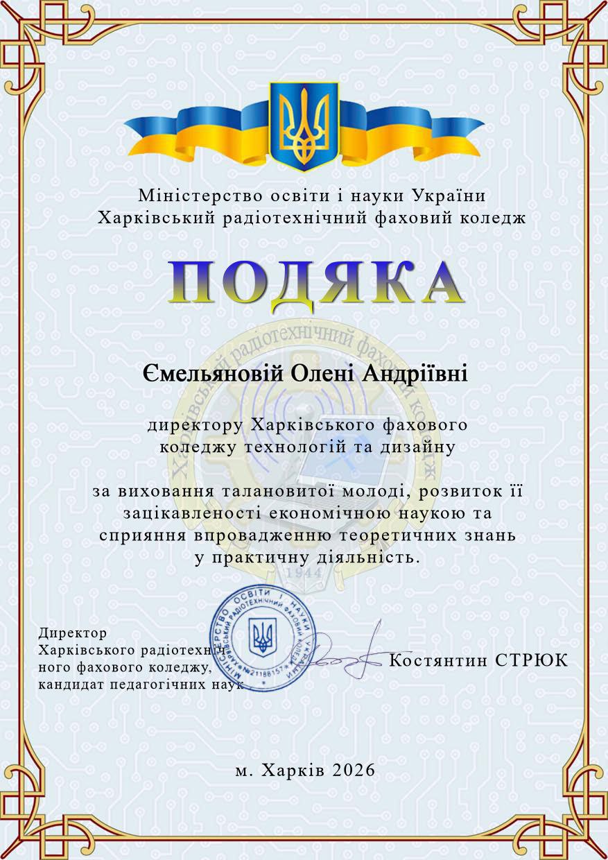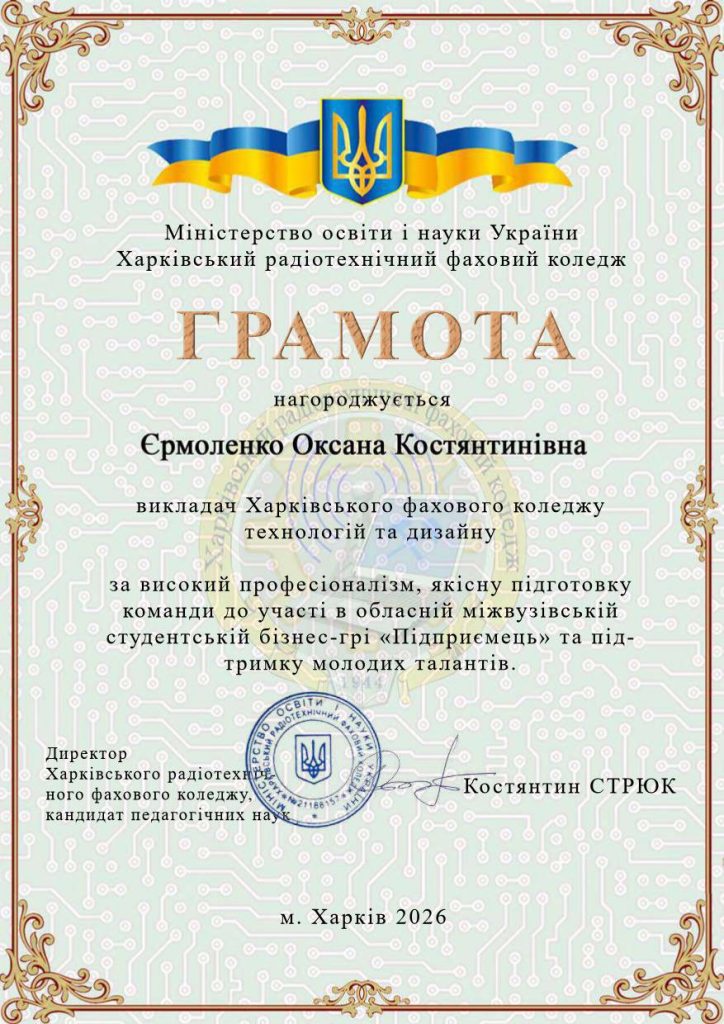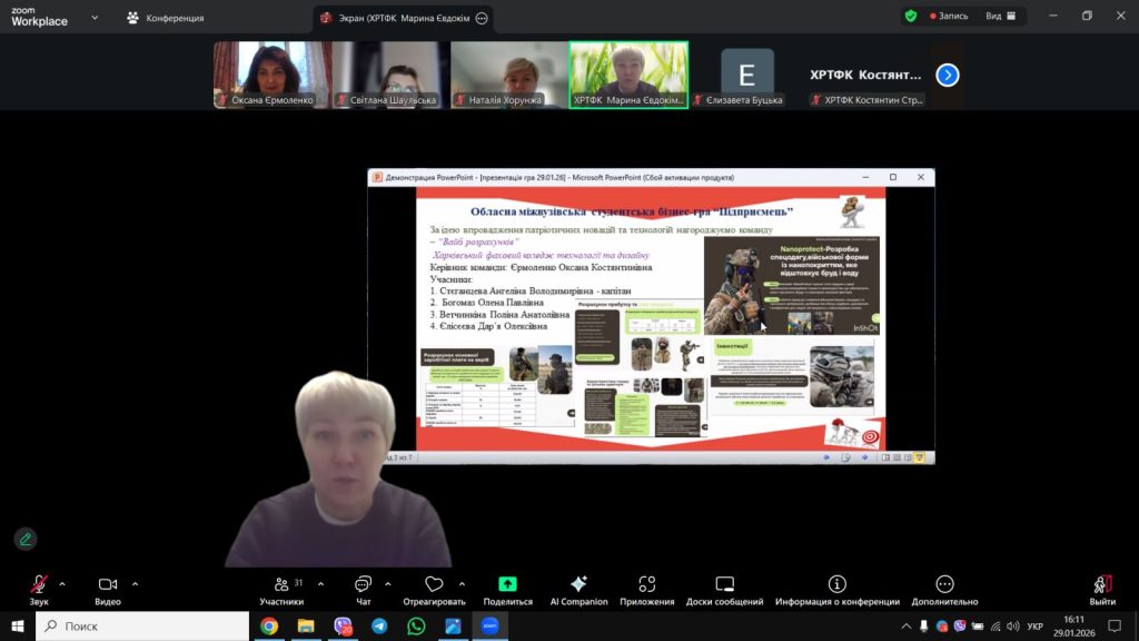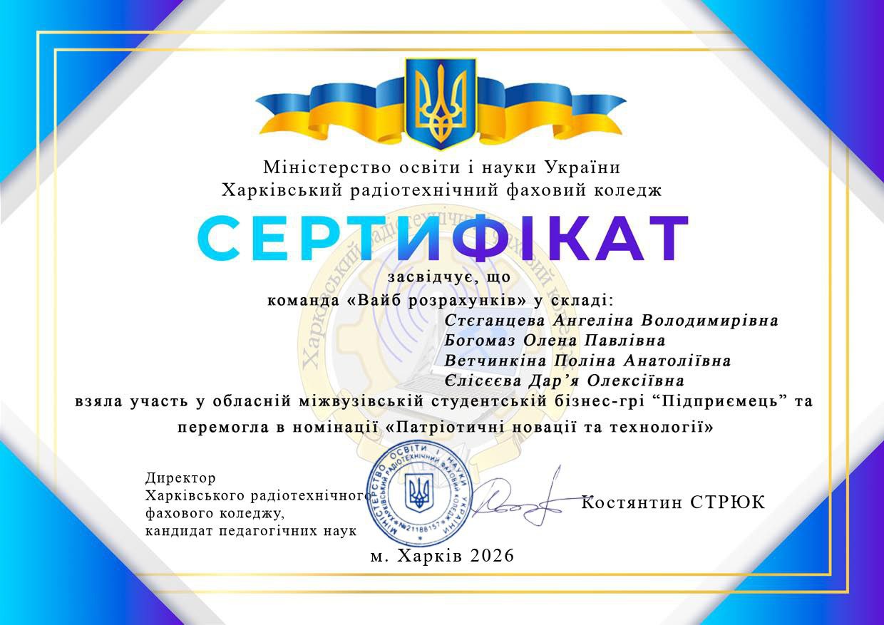 29 січня 2026р. студентки групи Е-31 Стєганцєва А. , Вєтчинкіна П., Богомаз О., Єлісєєва Д. та взяли участь в Обласній міжвузівській студентській бізнес – грі «Підприємець», яка проводилась в рамках економічного обласного метододичного обє’днання на базі Харківського радіо-технічного фахового коледжу.