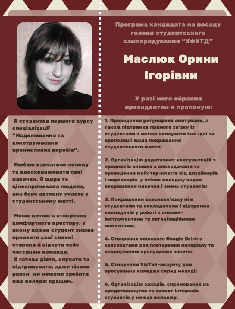Якщо я стану президентом студентського самоврядування, то хотіла б зосередити увагу на ефективній комунікації студентів та адміністрації коледжу, що дозволить ефективно вирішувати нагальні питання. Важливо зосередитись на забезпеченні різноманітних студентських заходів та ініціатив, наприклад таких як: день показу своїх робіт та одягу, подорожі з іншими групами до художніх музеїв, командні проекти та роботи.