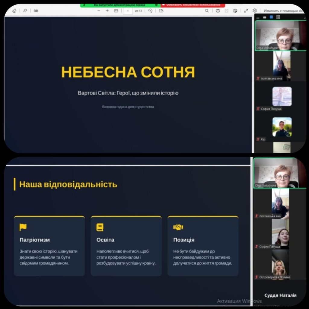 Мета: вшанувати пам’ять Героїв Небесної Сотні, прищеплювати любов до Батьківщини, розвивати почуття національної самосвідомості та активної громадянської позиції студентів.